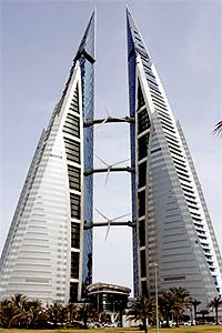 Em Barhein foi inaugurado um prédio com três hélices de 29 metros de diâmetro cada, que são usados para gerar energia elétrica. Cerca de 15% da energia consumida no prédio virá desses geradores eólicos, está longe de ser auto-suficiente, mas é uma ótima iniciativa.